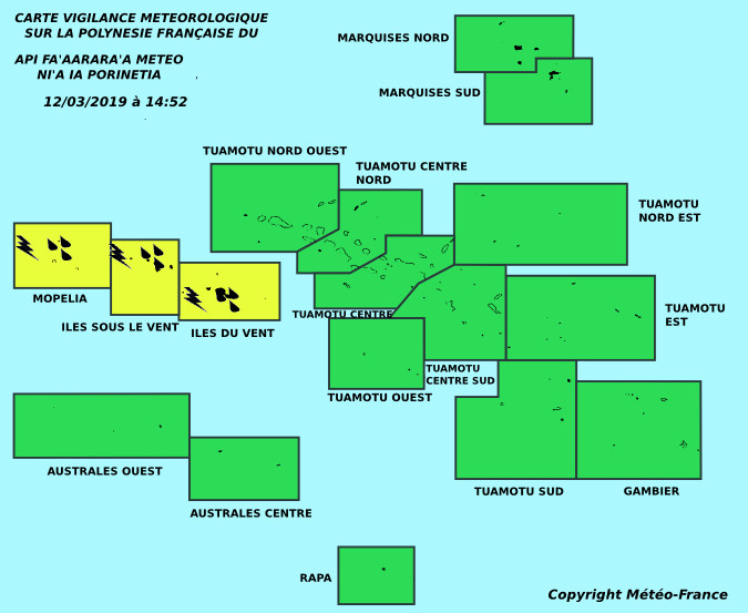 PAPEETE, le 12 mars 2019. Dans son bulletin publié ce mardi après-midi, Météo France annonce une vigilance jaune pour les orages et les fortes pluies sur Mopelia et l'archipel de la Société.