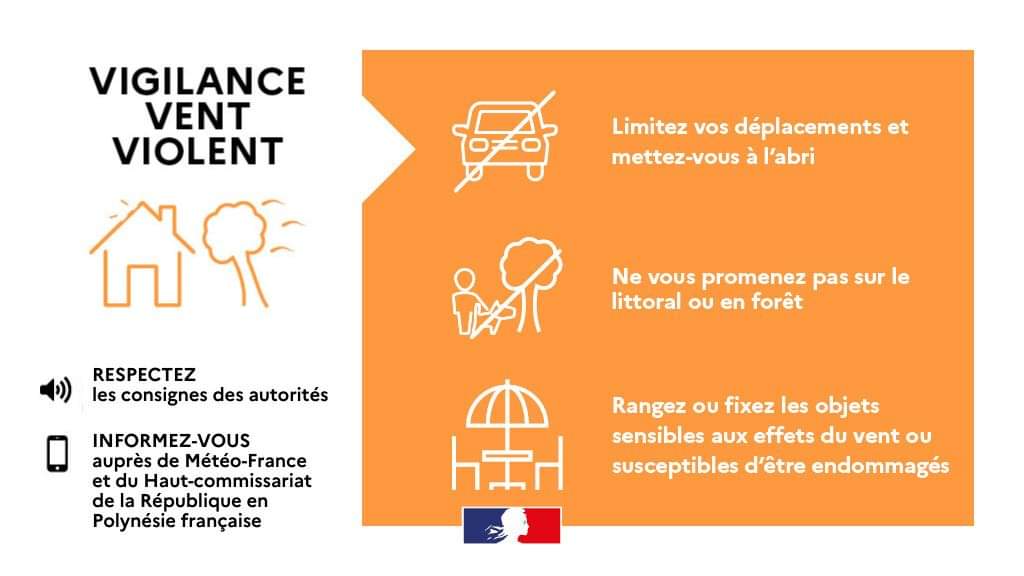 "Ce samedi après-midi et au cours de la nuit prochaine, des grains toucheront l'île de Rapa, générant des rafales pouvant atteindre jusqu'à 110 km/h. Un affaiblissement du vent est prévu à partir de dimanche", est-il précisé. La population est invitée à faire preuve de prudence et à respecter strictement les consignes de sécurité.
