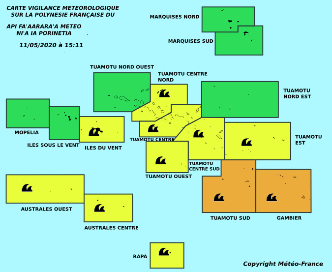 Tahiti, le 11 mai 2020 – Une grande partie de la Polynésie française a été placée sous vigilance pour forte houle. Des hauteurs de vagues allant jusqu'à 4,5 mètres sont attendues ce lundi soir dans la zone des Tuamotu Sud et des Gambier.