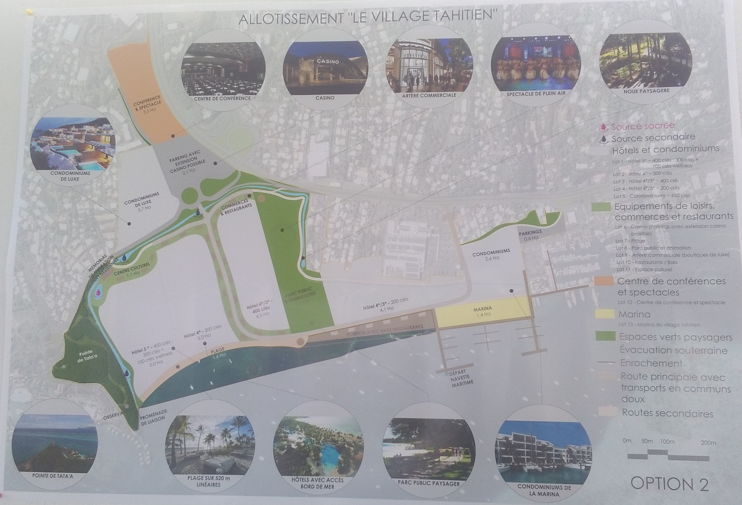 Pour l'instant ce sont six des seize lots du village tahitien qui sont concernés par l'appel à projet. Quatre hôtels deux lots de résidence en condominium. Dans le détail, il s'agit d'un hôtel de deux étages (R + 2) "haut de gamme", construit sur une parcelle dédiée de 4,4 hectares, en partie gagnée sur le lagon, à proximité de la pointe Tata’a. A une dizaine de mètres, un second hôtel "haut de gamme" de quatre étages avec vue sur Moorea, sur un lot de 2,7 ha de foncier en partie remblayé. En continuant sur le front de mer, au-delà d’une allée centrale bordée d’échoppes artisanales, large d’une trentaine de mètres et conduisant à une plage de 7,6 hectares, un troisième hôtel "haut de gamme" de 11 étages maximum. Le quatrième hôtel de ce projet de Village Tahitien est souhaité sur une bande littorale de 2,5 ha essentiellement gagnée sur le lagon.