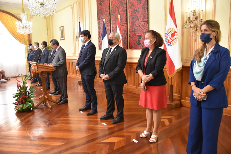 Tahiti, le 21 février 2022 – Le président du Pays, Édouard Fritch, a présenté lundi son quatrième et vraisemblablement dernier gouvernement de la mandature 2018-2023 avec l'entrée des ministres Virginie Bruant au Travail et à la Solidarité, Naea Bennett à la Jeunesse et aux Sports, la sortie d'Isabelle Sachet du gouvernement et une nouvelle répartition des portefeuilles du Tourisme, des Télécommunications ou encore des Ressources Marines…