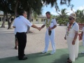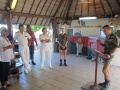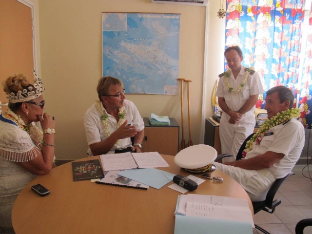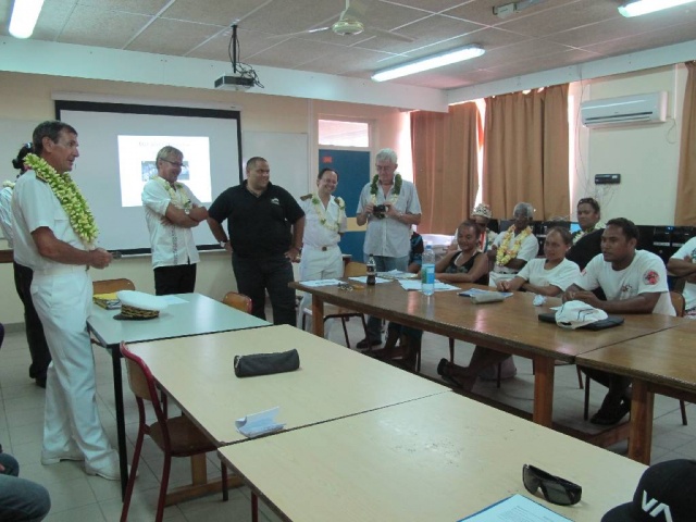 Dans le cadre du chantier de réhabilitation de l’atoll débuté en 2009, un détachement militaire est présent pour participer à la déconstruction des anciennes infrastructures du CEP. Le Capitaine du détachement, Jean-François Lahrer a présenté à la délégation l’avancée du chantier, ainsi que différentes actions menées au titre du partenariat avec le Pays, tels que le comblement d’ornières sur la route ou le nettoyage de la parcelle qui va accueillir prochainement le bâtiment de mareyage qui fait l’objet d’un cofinancement Etat-Pays au titre du Fonds Exceptionnel d’Investissement.