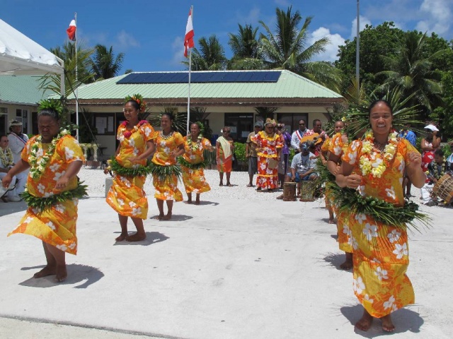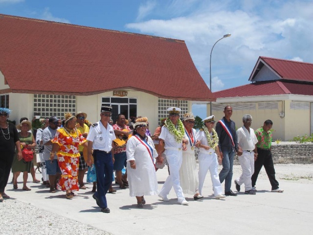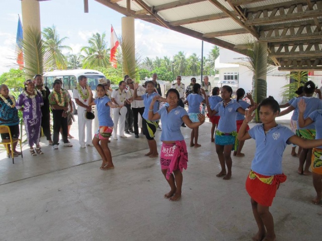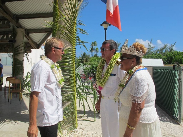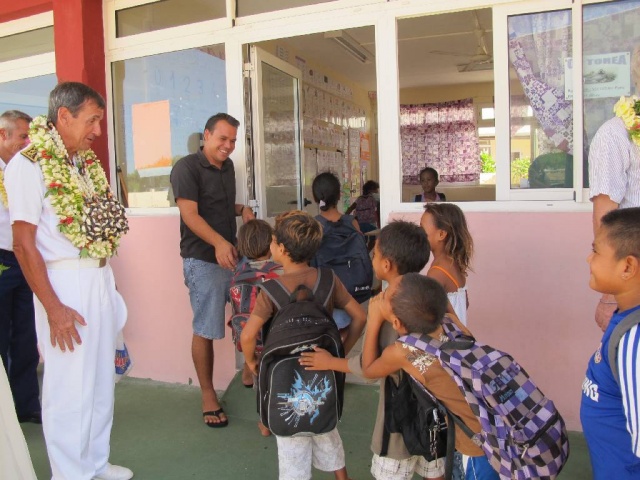 Le Haut-Commissaire a ensuite été accueilli par les chants des élèves de l’école primaire. Une subvention du Fonds Intercommunal de Péréquation (FIP) à hauteur de 80% a permis la rénovation de l’école primaire, la réfection de la cantine et de l’école maternelle, ainsi que la réhabilitation du préau. Grâce aux efforts conjugués de la Mairie, du SIVMTG (Syndicat Intercommunal à Vocation Multiple des Tuamotu-Gambier) et de l’Etat, les élèves ont pu effectuer leur rentrée en août 2011 dans ces nouveaux locaux. Les travaux réalisés par l’entreprise Hydroalpha ont permis une embauche locale de 23 personnes. Des travaux complémentaires sont en cours de réalisation, notamment dans la salle informatique de l’école primaire.