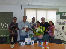 Madame Turia Tavita reçoit son pack mobile des mains de Mario Nouveau. Egalement sur la photo Mme Lina CORNETTE et M Jeremy HADJIBELY qui s’étaient abonné à l’internet nomade Viti peu avant/après Turia.