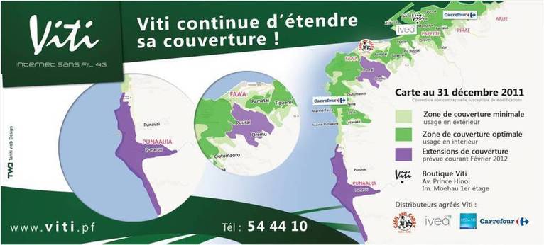 C'est donc avec beaucoup de sérénité que Viti annonce son programme de déploiement à venir: la couverture sur les quartiers de Puurai et Oremu à Faa’a (fin février 2012) et au sud de Punaauia (ZI Punaruu, Atiue et les alentours du Méridien)
