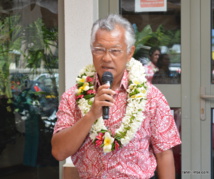 Gaston Tong Sang accompagne Nina et Albert Moux pour inaugurer la nouvelle boutique Vodafone de Bora Bora