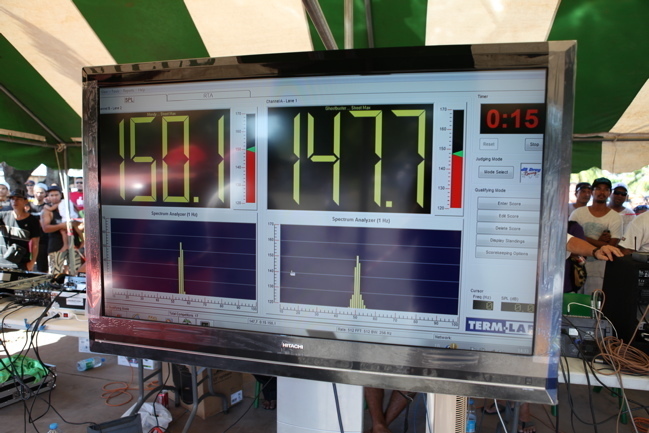 Deux voitures se positionnent côte à côte pour le duel, les sondes sont installées à l’intérieur de leur habitacle et un écran permet à la foule de voir l’intensité de chaque système audio au top départ. On n’entend pas de musique, juste une vibration « sourde » et intense accompagnée des hourras de la foule. Ensuite le présentateur recommence ses blagues sur fonds musical et annonce le duel suivant.