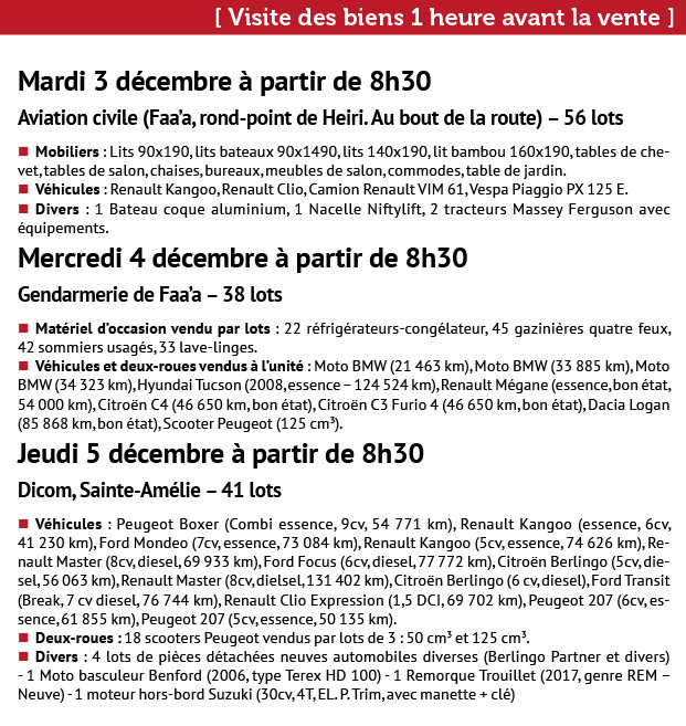 La dernière journée de cette vente exceptionnelle aura lieu vendredi 5 décembre à la Direction du commissariat d’Outre-mer, vallée de Sainte-Amélie à Papeete. Ce jour-là, 13 véhicules citadins ou utilitaires et une vingtaine de scooters seront vendus aux plus offrants.