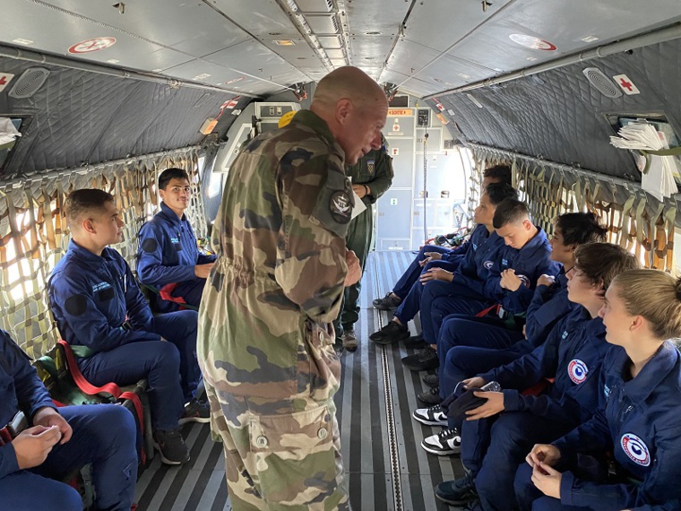 Les jeunes des Escadrilles Air Jeunesse qui s'installent dans le CASA CN-235. Crédit photo : Thibault Segalard.