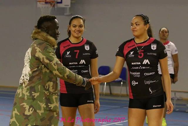 Sur la photo, les jumelles en compagnie de Bakari Sagna joueur de foot en équipe de France, qui est originaire de Sens et qui est venu encourager les filles de Sens en Coupe de France. SB / FTVB