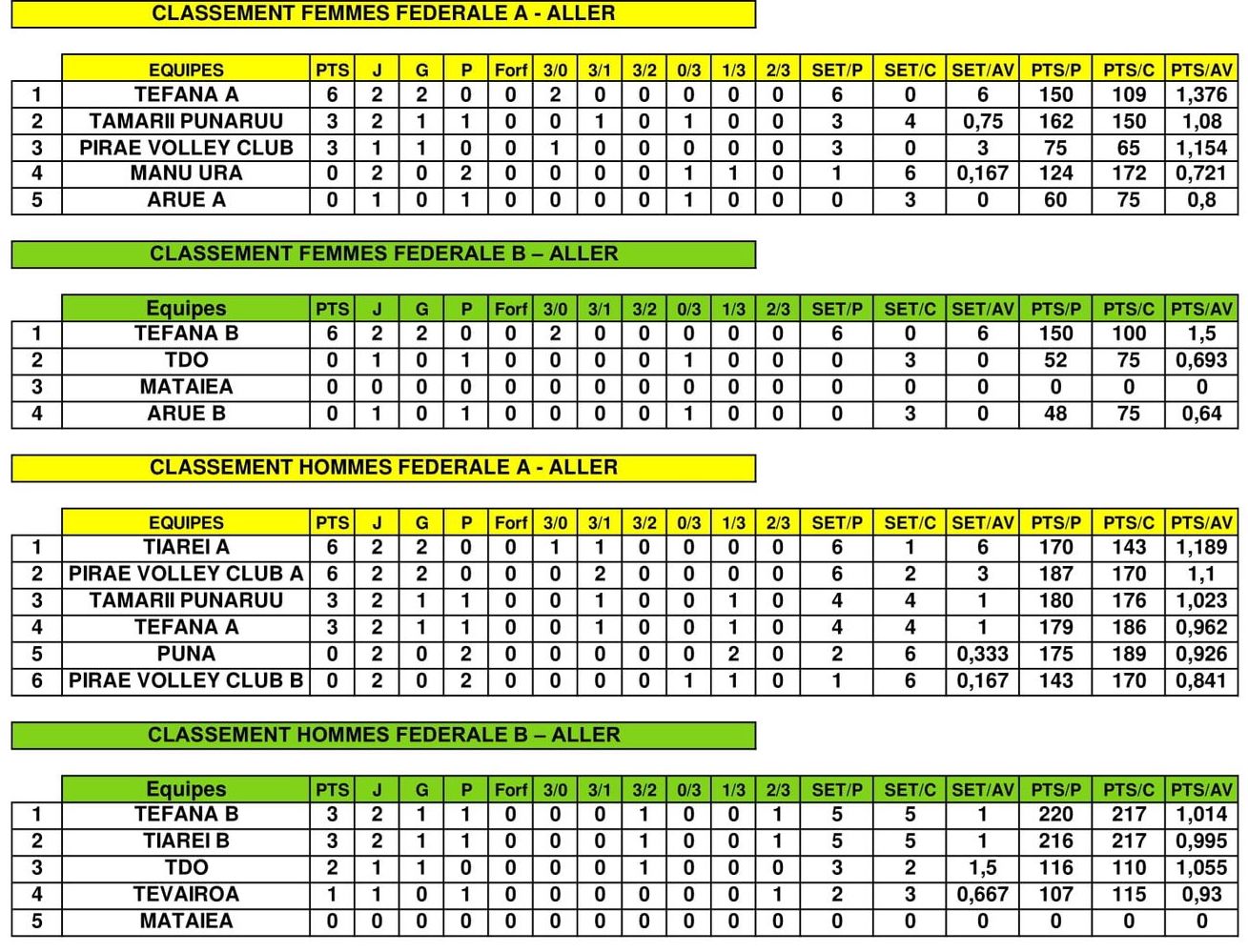 Du côté des dames, le championnat en Fédéral A est actuellement dominé par Tefana, qui a signé, vendredi, son deuxième succès face à Arue (3 sets à 0). Derrière les joueurs de Faa'a, on retrouve Tamarii Punaruu qui a pris le meilleur sur Manu Ura (3 sets à 1).