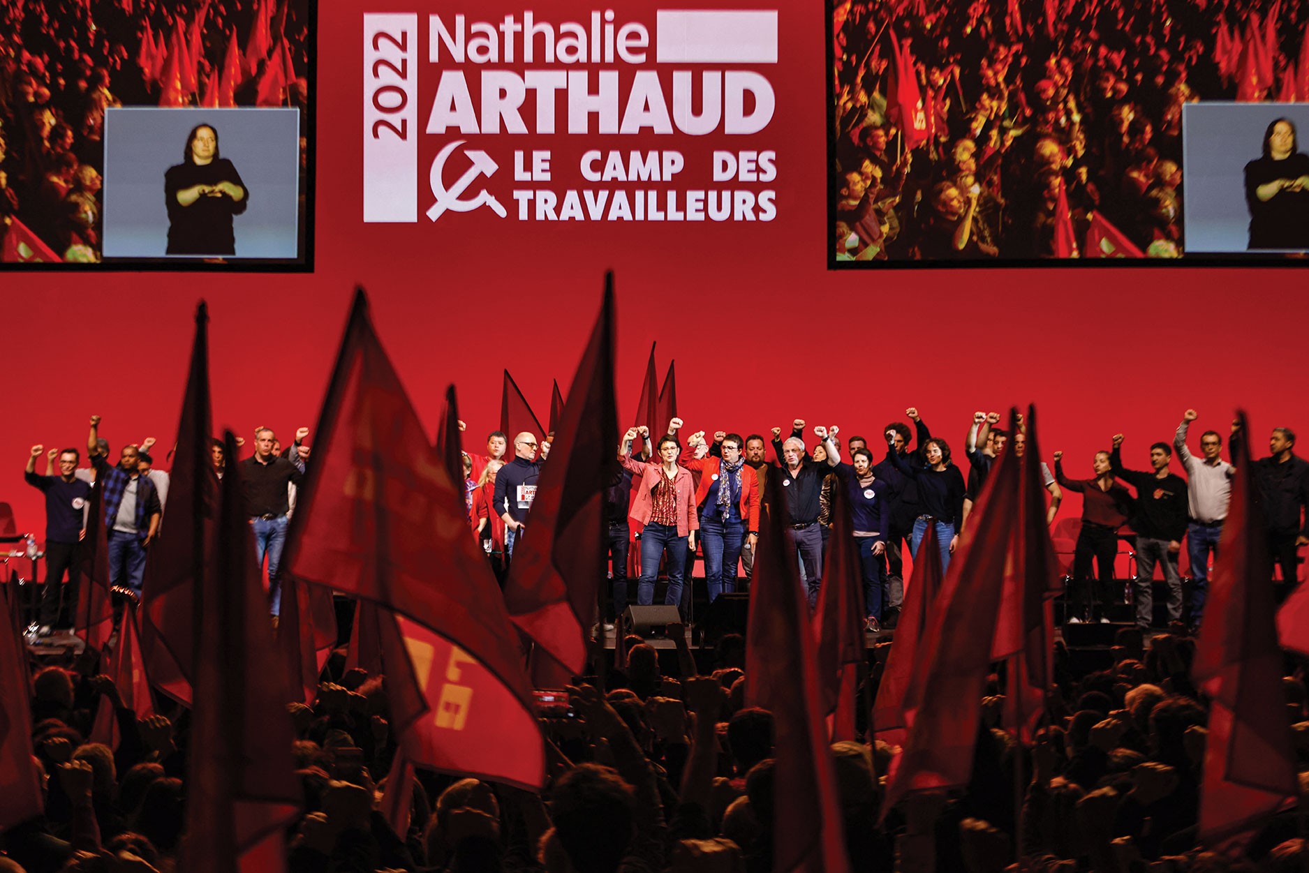 "Alors pourquoi voter pour moi? Parce qu’il faut affirmer la nécessité de se battre et de renverser le capitalisme", a martelé Nathalie Arthaud, sur fond rouge marqué de son slogan, "le camp des travailleurs".