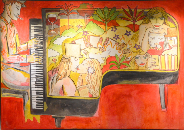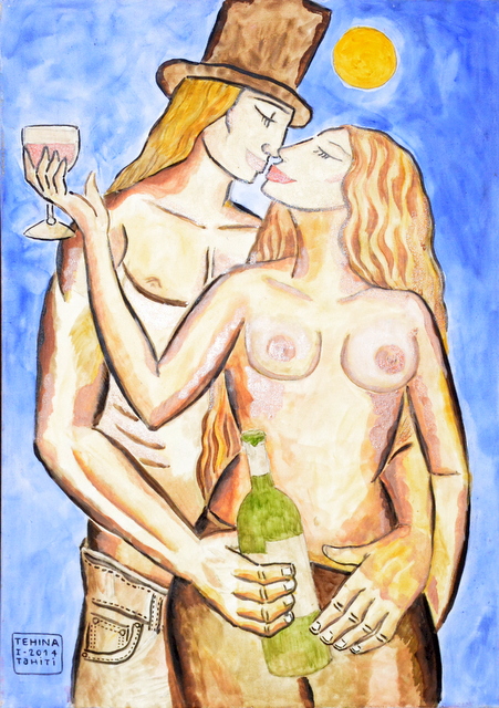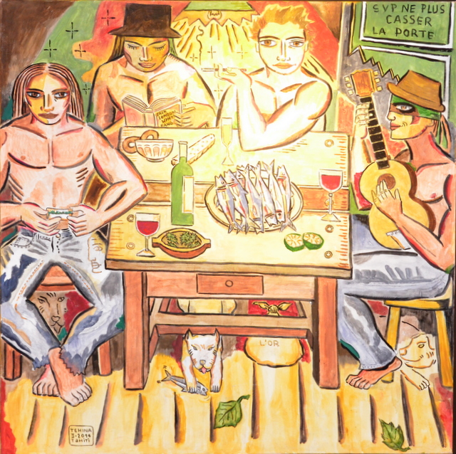 C’est la déclinaison d’une certaine réalité de la Polynésie. Celle du peintre qui depuis bientôt 30 ans aborde ces thèmes en les combinant sans cesse et de manière toujours renouvelée : la joie de vivre entre amis et sans le sou, l’ivresse noctambule, la fidélité animale, l’amour, le jeu, la bohème : "le trip, comme on dit", complète-t-il simplement.