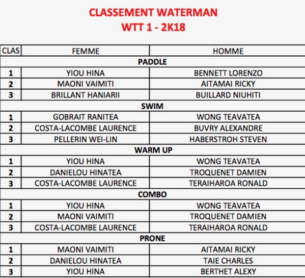 Nous noterons malgré tout l’excellente performance du jeune Teavatea Wong qui s’impose au classement waterman, celui où il faut faire toutes les épreuves. Teavatea Wong est issu de la natation, il a pu profiter de l’absence d’un autre nageur émérite, Keahi Agnieray, qui se consacre cette année à la pirogue. A noter l’absence cette année de Bruno Tauhiro (champion 2014-2015-2016) et de Tamarua Cowan (champion 2017), ce qui va donc créer des ouvertures. Chez les « kids », Lizaic Boissière s’impose chez les filles et Keanalu Lambert chez les garçons. SB