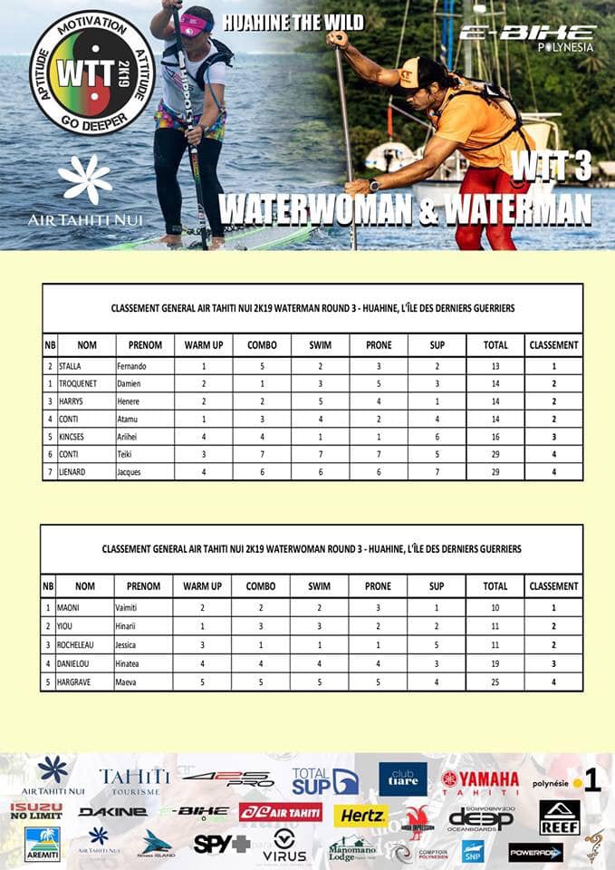 En ce qui concerne l’épreuve du Waterman Tahiti Tour, victoire pour la première fois du Mexicain Fernando Stalla devant Damien Troquenet, le champion du Waterman Tahiti Tour 2018, et Henere Harrys. Fernando a remporté le « warm up », l’épreuve surprise, et a obtenu ensuite de bons résultats dans toutes les épreuves. Chez les femmes, c’est Vaimiti Maoni, la championne du Waterman Tahiti Tour 2018, qui s’impose devant Hinarii Yiou et Jessica Rocheleau.