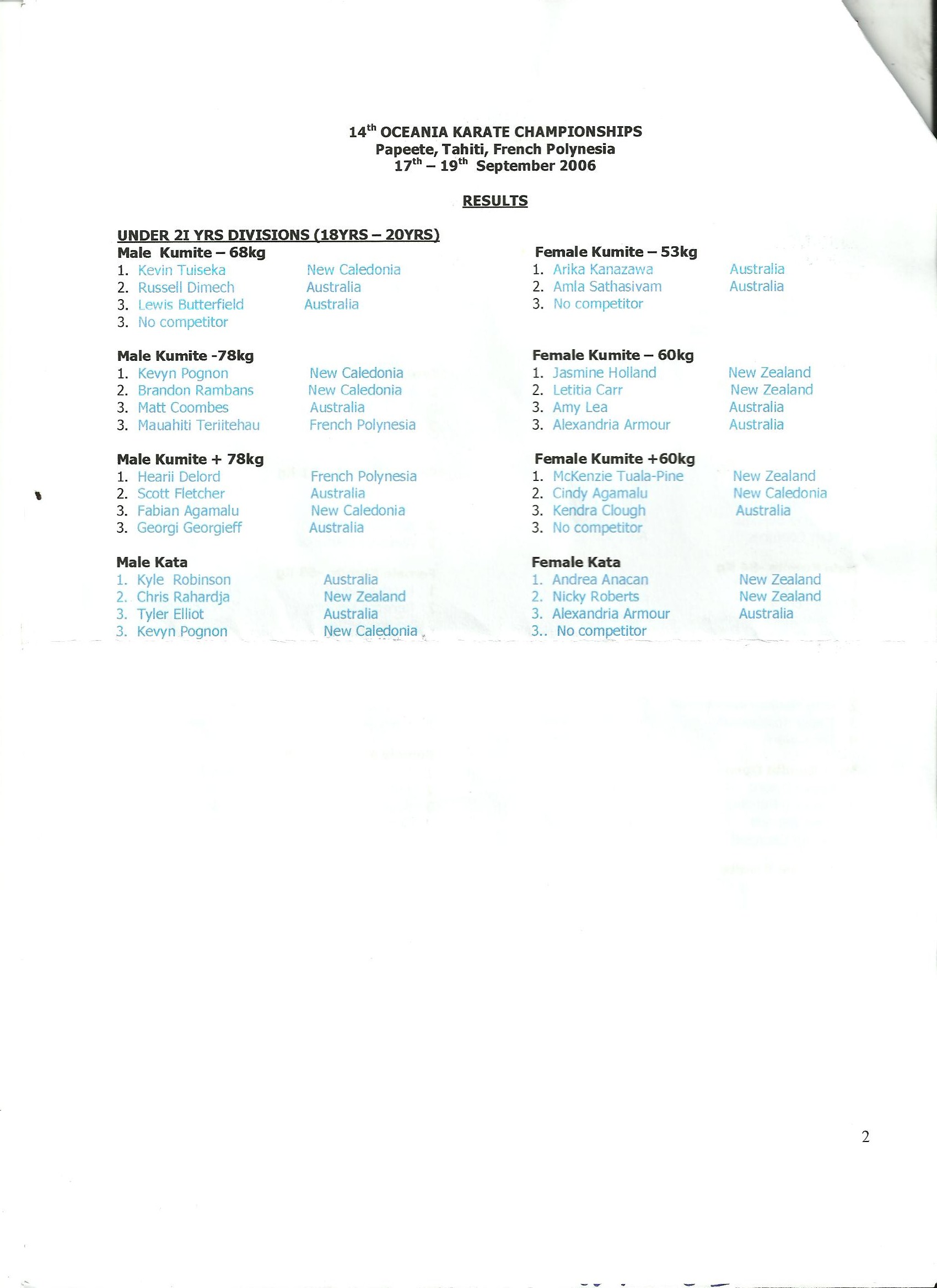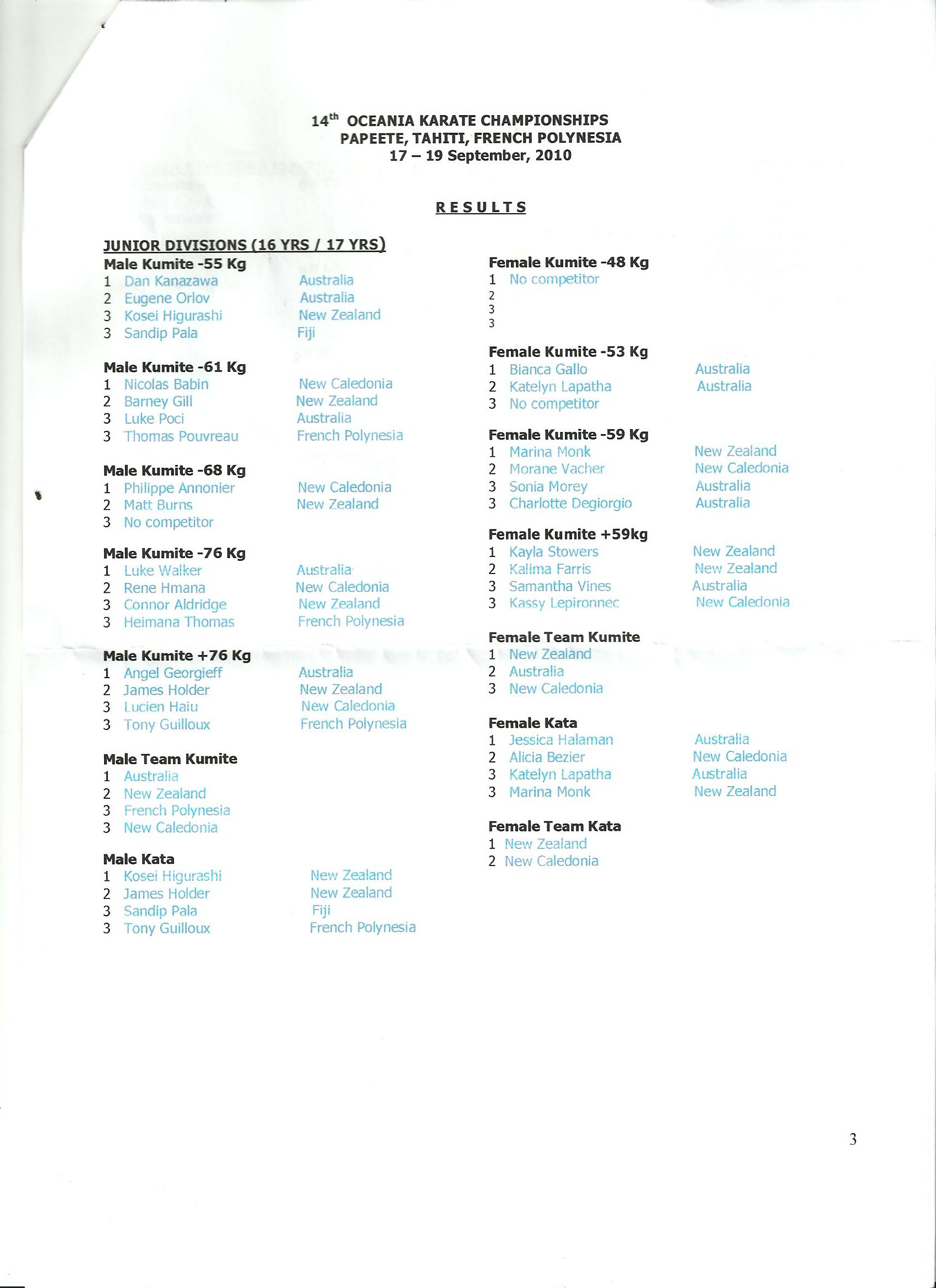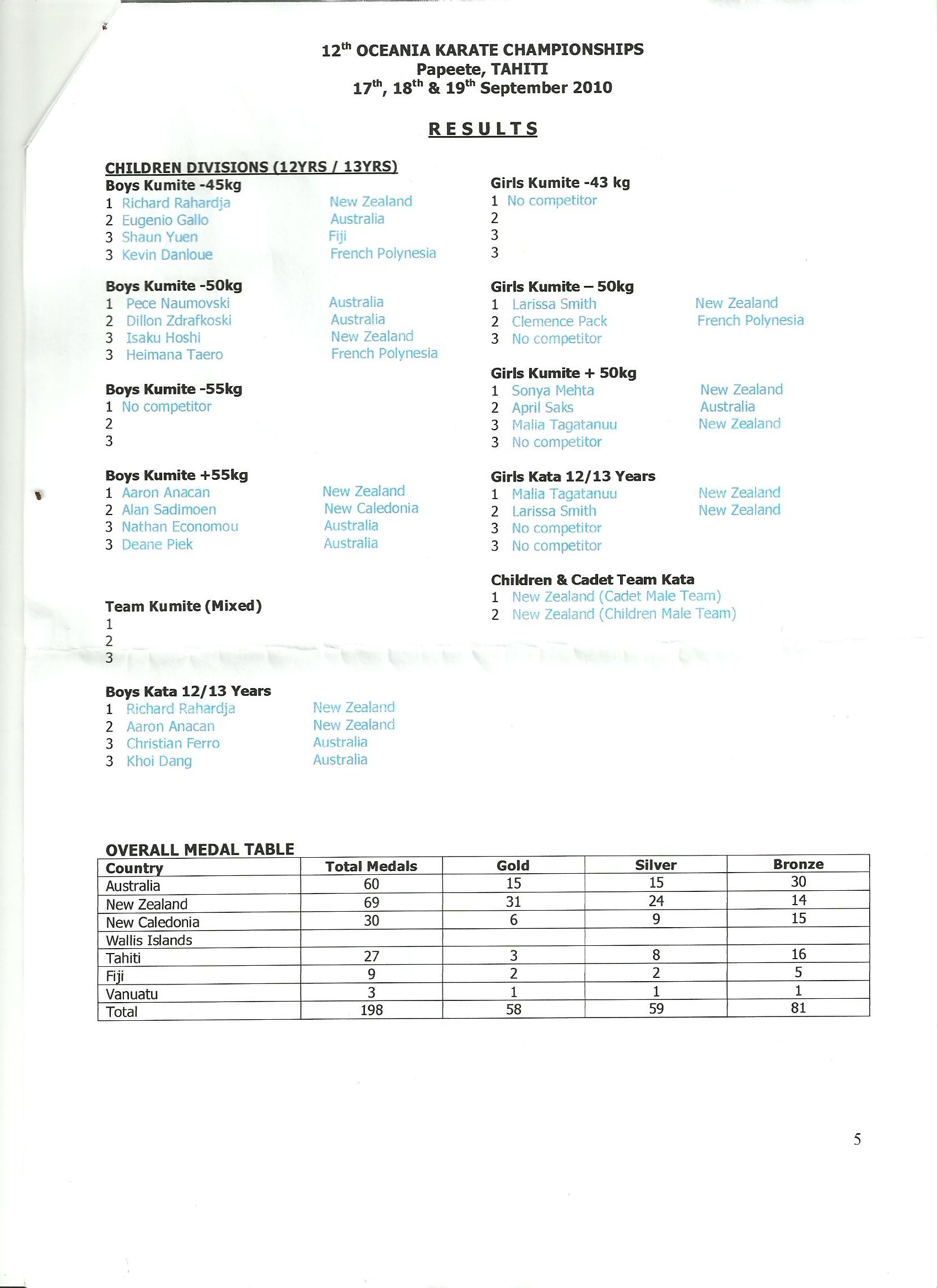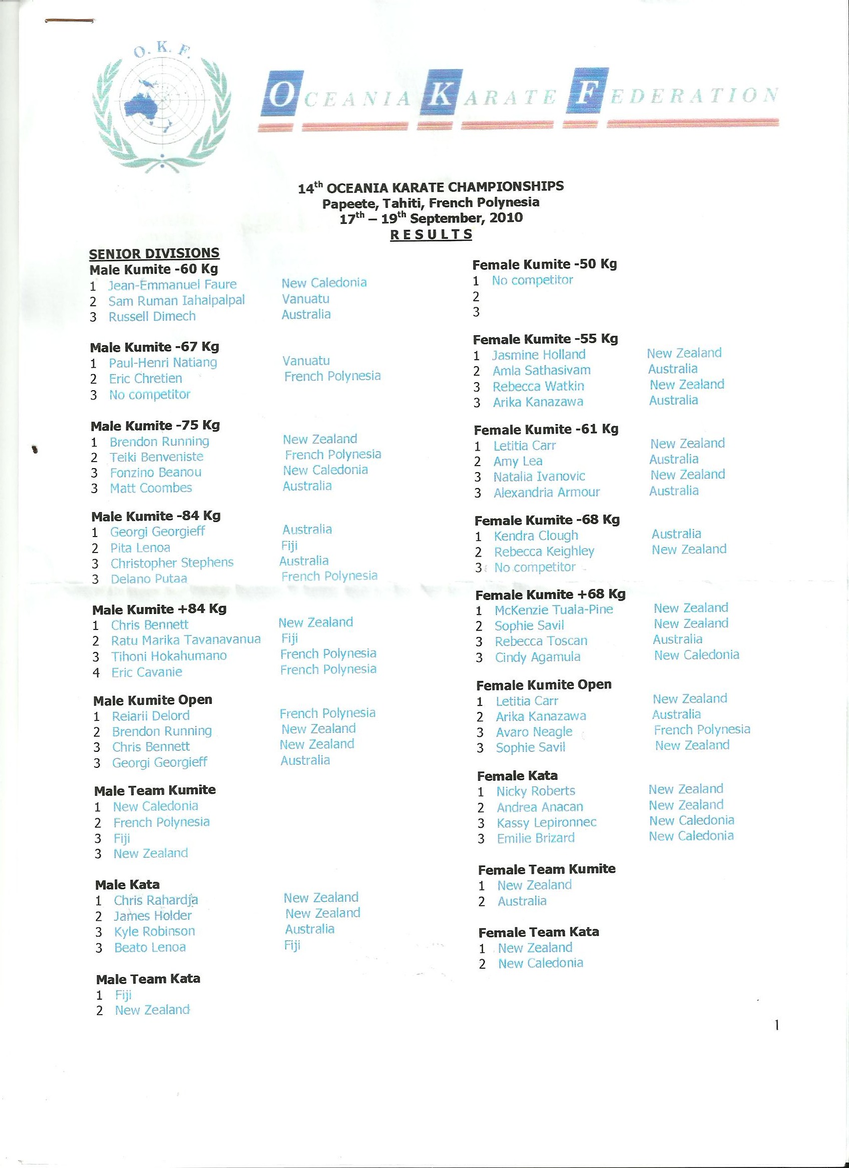 Après trois jours de compétition acharnée, les XIVe Championnats d’Océanie de Karaté se sont terminés dimanche dernier. La Nouvelle Zélande écrase la concurrence et même l’Australie et la Nouvelle Calédonie ne peuvent tenir la distance. La sélection tahitienne est très proche de la Nouvelle-Calédonie au classement, tandis que Fidji et le Vanuatu ferment la marche. Objectif pleinement réussi pour la sélection locale, qui même si elle ne parvient pas à surclasser ses rivaux de toujours, remporte une belle moisson de médaille. La sélection de Tahiti fait ainsi bonne figure avec une performance impressionnante de Raiarii Delors ainsi que de l’équipe Kumite Polynésienne malheureusement amputé de Teiki Beneveniste, déclaré forfait la veille à la suite d’une décision d’arbitrage contestable. Les sélections étrangères ont été particulièrement surprises par la qualité de l’organisation locale qui est selon eux un exemple à suivre. Les prochains OCEANIA de Karaté se dérouleront dans 2 ans en Australie (Sydney).
