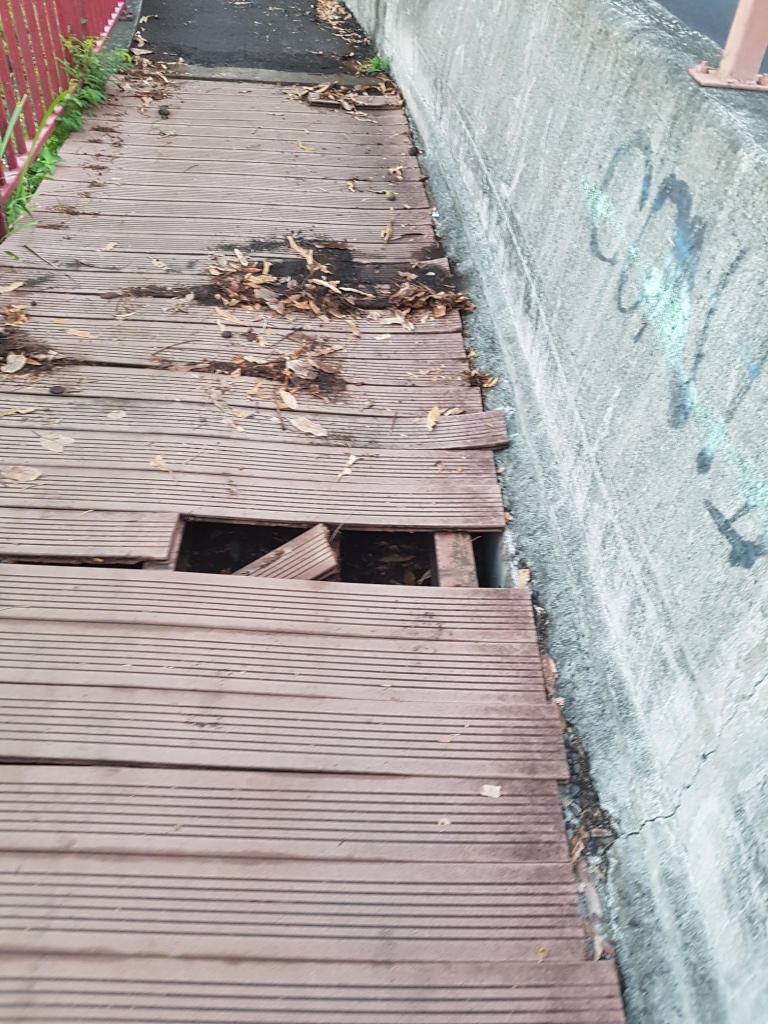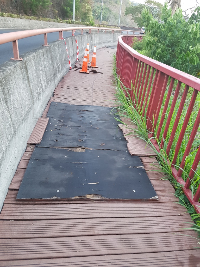 Les éléments, et les nombreux passages de marcheurs, et de joggeurs ont eu raison d'une partie de la zone piétonne de la montée du Taharaa, entre Arue et Mahina. Des trous ont en effet fait leur apparition, et pour les combler des planches de contreplaqués ont été installées, en attendant le début des travaux de rénovation.