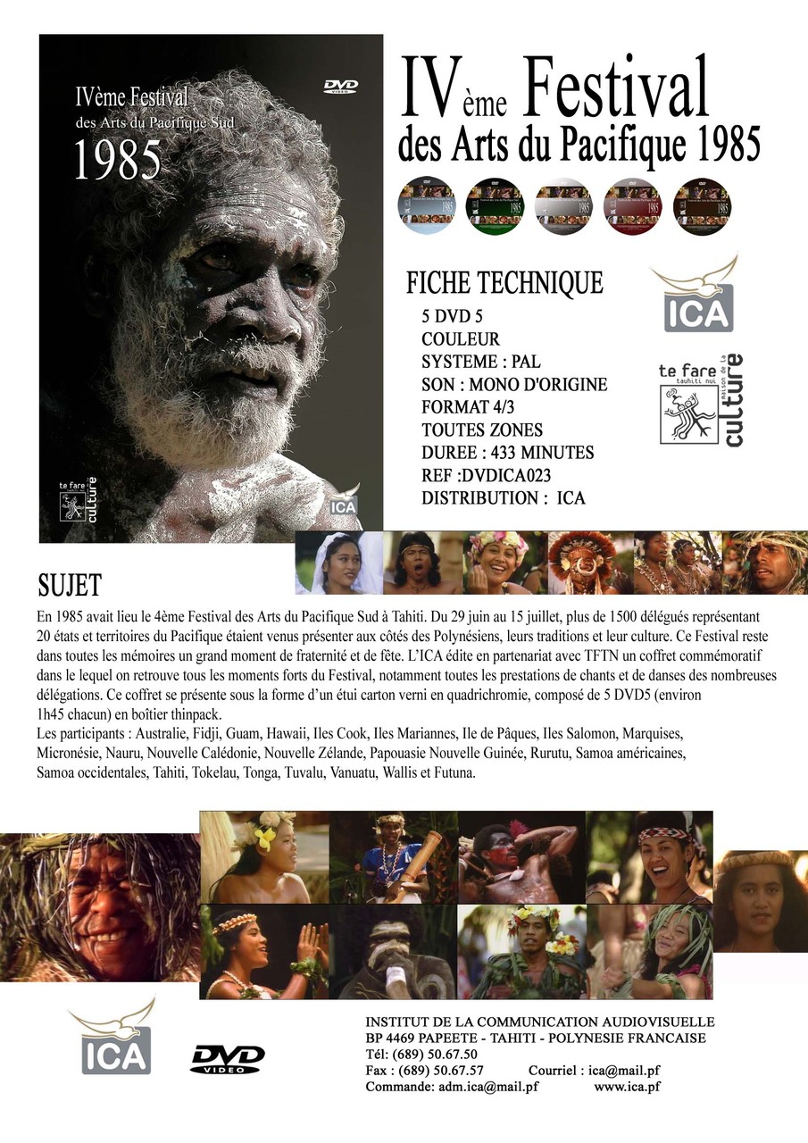 En 1985, Tahiti accueille donc le 4ème Festival des Arts du Pacifique Sud. Celui-ci reste dans toutes les mémoires comme un grand moment de fraternité et de fête. A l’époque, l’ICA encore naissant avait produit en partenariat avec le Comité d’organisation du festival une collection de cassettes vidéos et réalisé pour cela des captations de l’ensemble des spectacles donnés sous la direction des réalisateurs Hina Sylvain et Jacques Navarro.