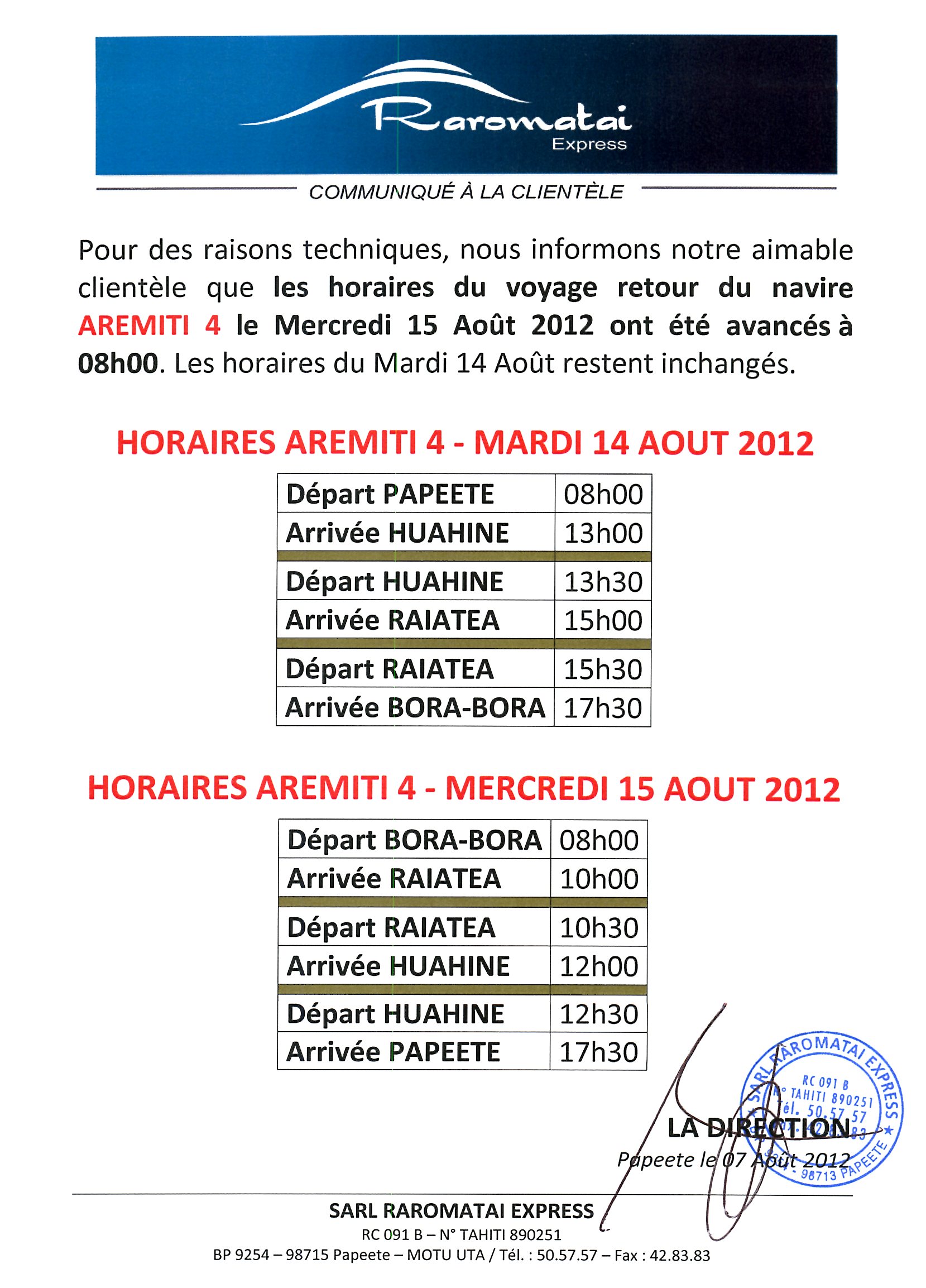 Pour des raisons techniques, le départ de Bora Bora le Mercredi 15 Août 2012 initialement prévu à 12h00 se fera à 08h00. Vous trouverez ci-joint notre dernier communiqué clientèle à titre informatif. Ø Les rotations du Vendredi 17 et Dimanche 19 Août 2012 seront également annulées. La reprise des voyages du navire AREMITI 4 est ainsi fixée au Vendredi 24 Août 2012 aux horaires habituels. |