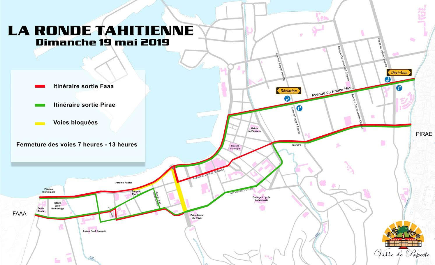 L’avenue du prince Hinoi notamment, les carrefours du Cours de l’Union sacrée et de l’avenue du régent Paraita ne pourront être franchis. |